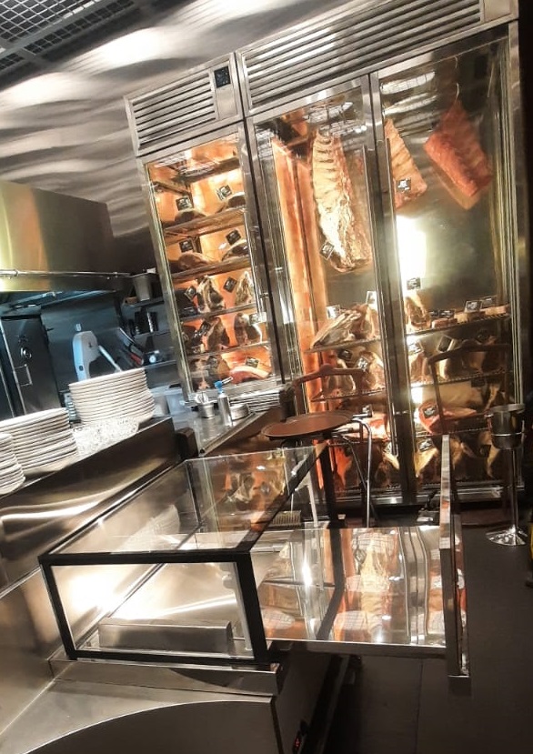 В ресторане так же Вы сможете увидеть холодильную витрину для демонстрации стейков серии Каллитропсис с выезжающей выкладкой (1000*800*900 мм), t: 0...+7С и ювелирной выкладкой и освещением.