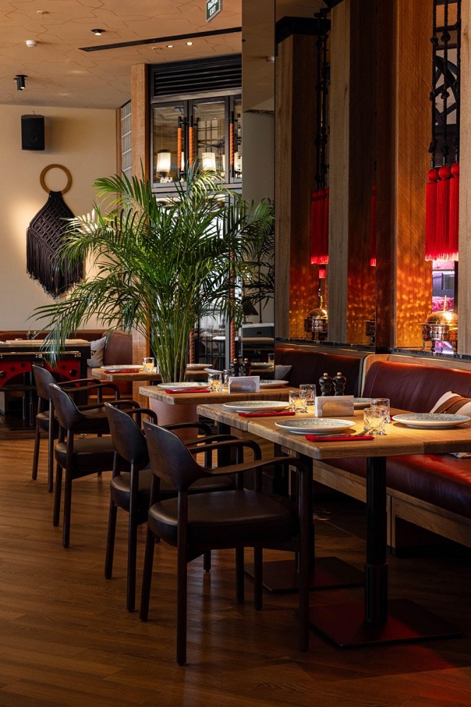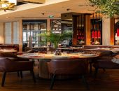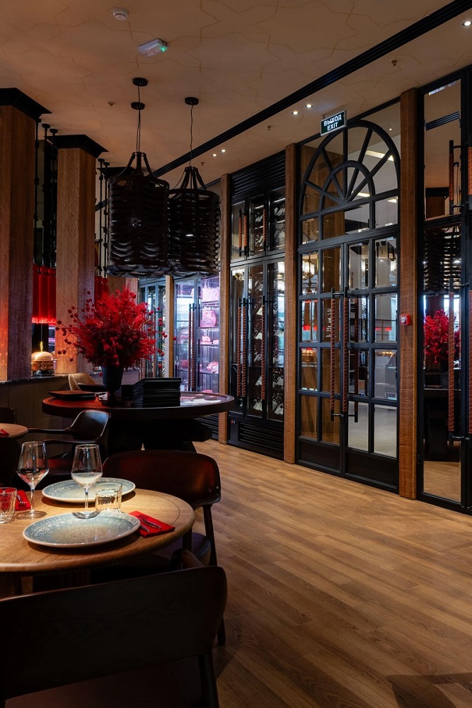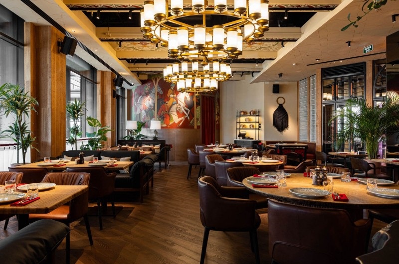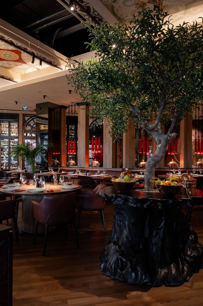 В интерьере сделали акцент на тёплые природные оттенки, деревянные текстуры и натуральную кожу: в приглушённом свете ламп такое сочетание выглядит особенно уютно и по-домашнему. Столики, выполненные из премиальных материалов, окружены мягкой мебелью, цветущими растениями и деревьями. Стены украшают декорации на тему восточных традиций. Фигурки из бронзы и латуни, светильники в восточном стиле, изделия из макраме — в каждой детали передали колорит и настроение современной Турции.