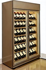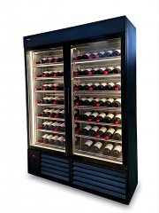 Винный шкаф 1500, предназначен для демонстрации охлажденного вина, расположение бутылки просчитано таким образом, что б демонстрировать все великолепие этикетки, тем самым провоцируя на покупку. Эстетика стеллажной структуры выполнена из натурального дуба под покрытием масло воск. Натуральное дерево придает шкафу аутентичность и подчеркивает благородство охлаждаемых напитков.